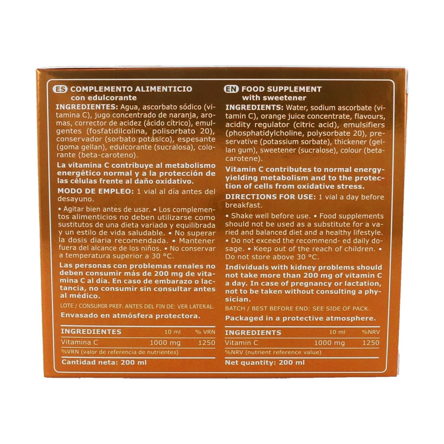 Wasser, Natriumascorbat (Vitamin C), konzentrierter Orangensaft, Aromen, Säureregulator (Zitronensäure), Emulgatoren (Phosphatidylcholin, Polysorbat 20), Konservierungsmittel (Kaliumsorbat), Verdickungsmittel (Gellangummi), Süßungsmittel (Sucralose), Farbstoff (Beta-Carotin).