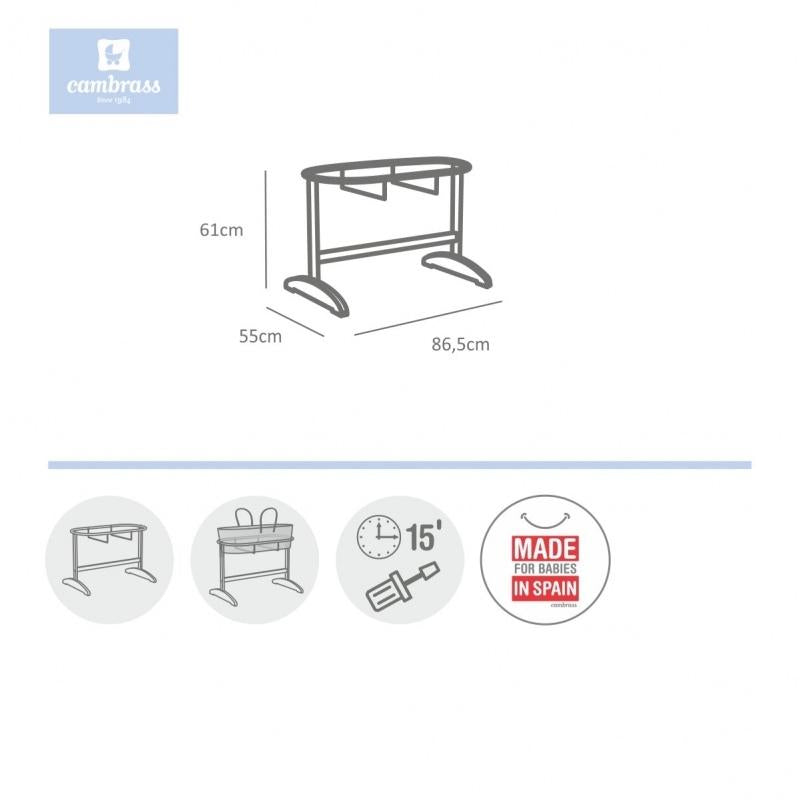 Le couffin en bois Cambrass sans roulettes convient aux couffins Cambrass et à d'autres couffins de taille similaire. Fabriqué en bois laqué blanc, sa hauteur permet à l'adulte de garder un œil sur bébé en permanence.