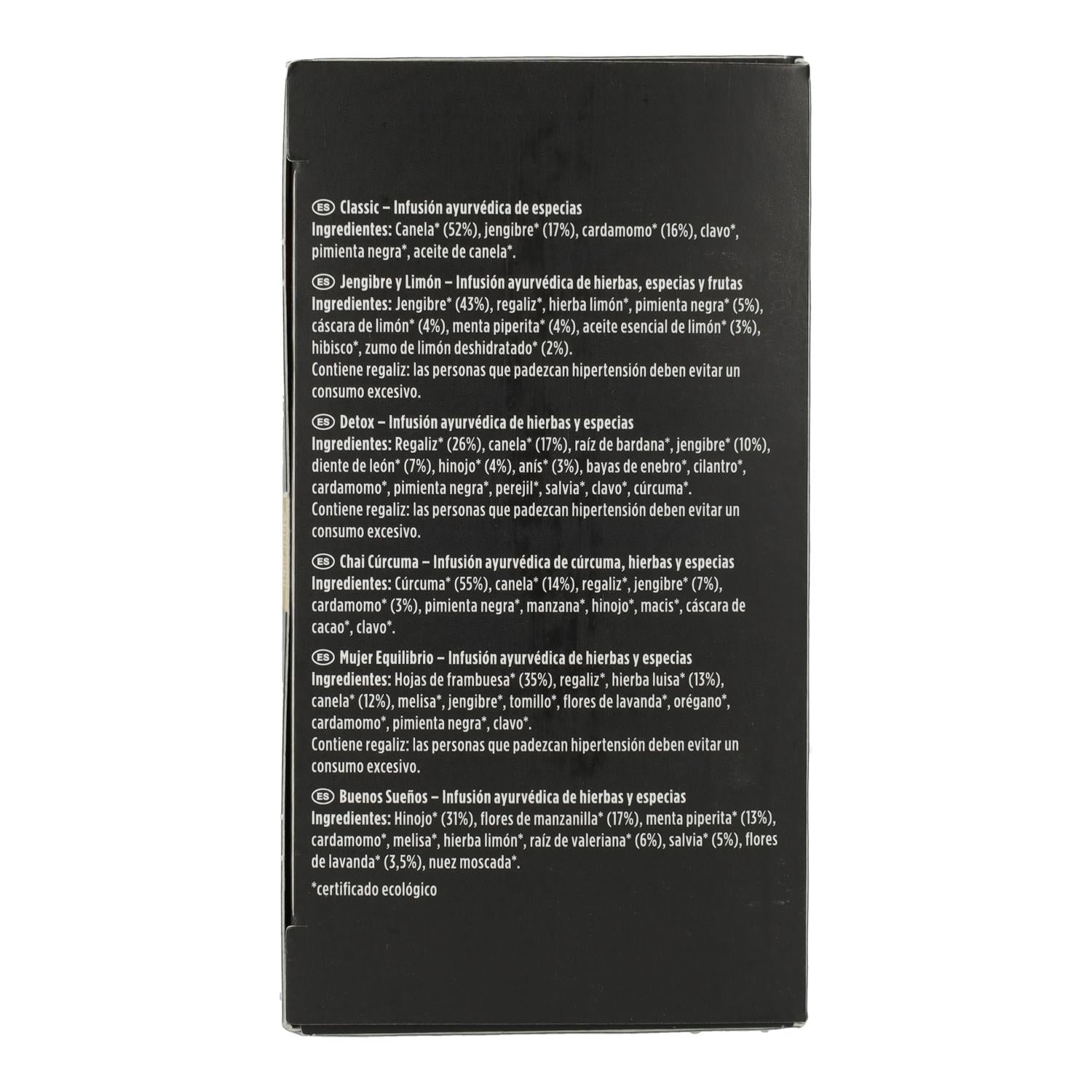 - Chai au curcuma : Curcuma* (55%), cannelle* (14%), réglisse*, gingembre* (7%), cardamome* (3%), poivre noir*, pomme*, fenouil*, macis*, coque de cacao*, clou de girofle*.