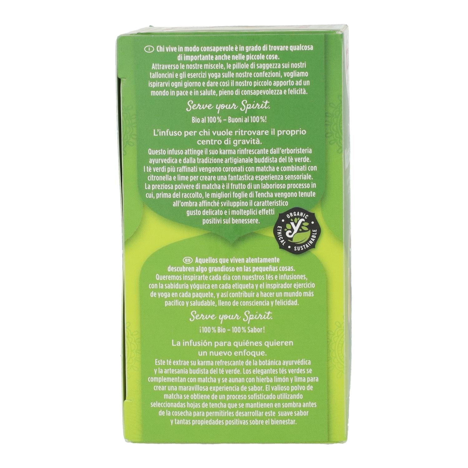 Infusion biologique qui associe thé vert Sencha, poudre de matcha, citronnelle et agrumes, créant un mélange rafraîchissant et harmonieux.