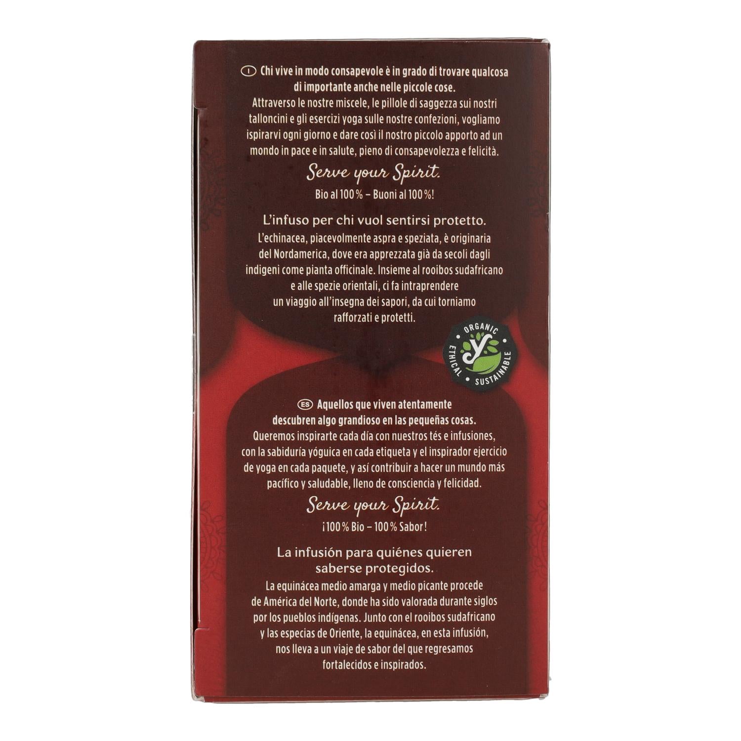 La infusión Yogi Tea BIO Equinácea es una mezcla ayurvédica que combina equinácea con otras hierbas y especias para fortalecer el sistema inmunológico y proporcionar una sensación de bienestar. Su sabor ligeramente amargo y especiado la convierte en una opción reconfortante para cualquier momento del día.