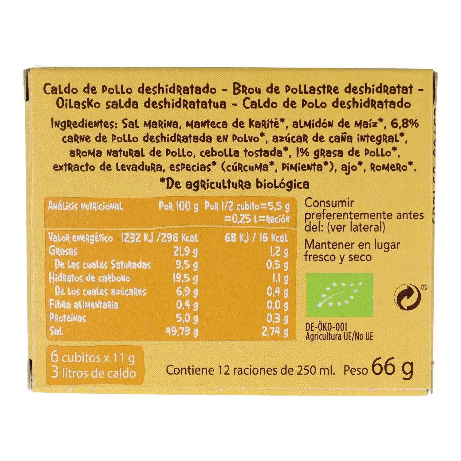 Ingrédients : Sel marin, beurre de karité*, fécule de maïs*, viande de poulet déshydraté* 6,8 %, sucre de canne complet*, arôme naturel de poulet, oignon grillé*, graisse de poulet*1%, extrait de levure, épices* (curcuma*, romarin*), ail*, romarin*. *Issu de l'agriculture biologique. *Issu de l'agriculture biologique.