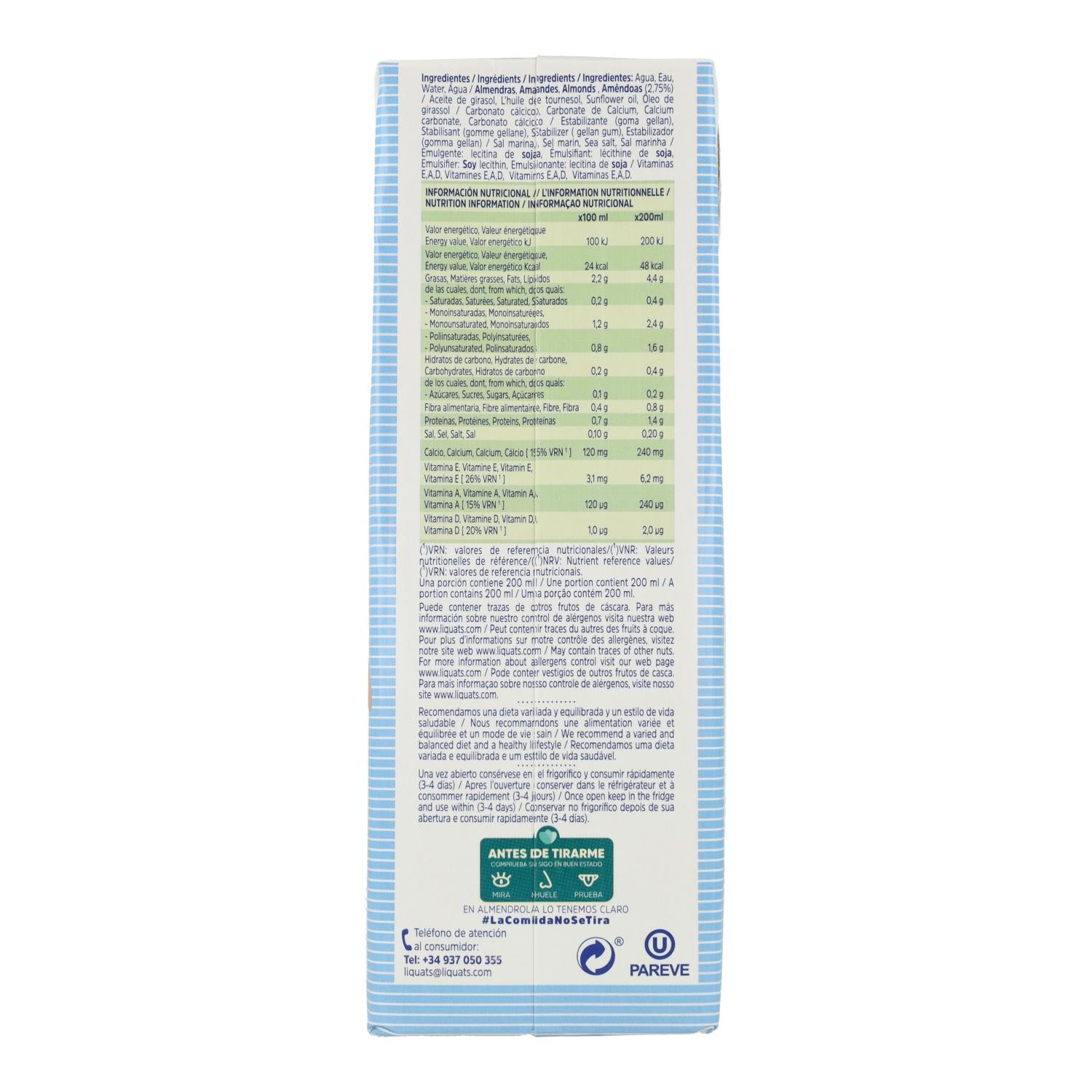 Ingrédients: Eau de Montseny, amande (2,75 %), huile de tournesol, carbonate calcium, gomme gellane, émulsifiant : lécithine de tournesol, sel marin, Vitamines A, D et E. Allergènes : Amande, peut contenir des traces de soja et/ou d’autres fruits à coque.
