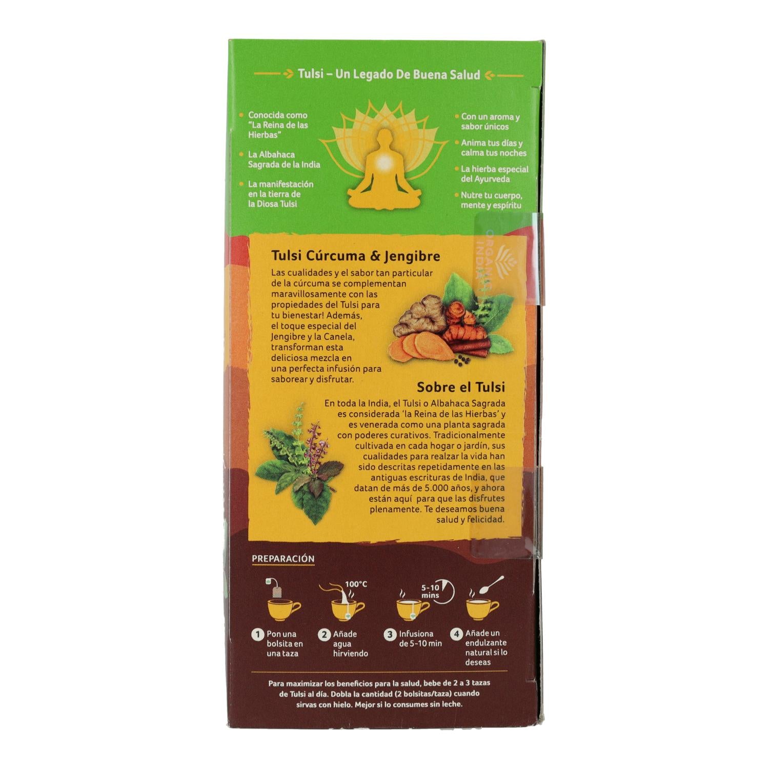 Tulsi, curcuma et gingembre bio d'Inde est une infusion ayurvédique biologique qui soulage le stress et favorise l'harmonie. Maintenant disponible en boîtes de 25 sachets .