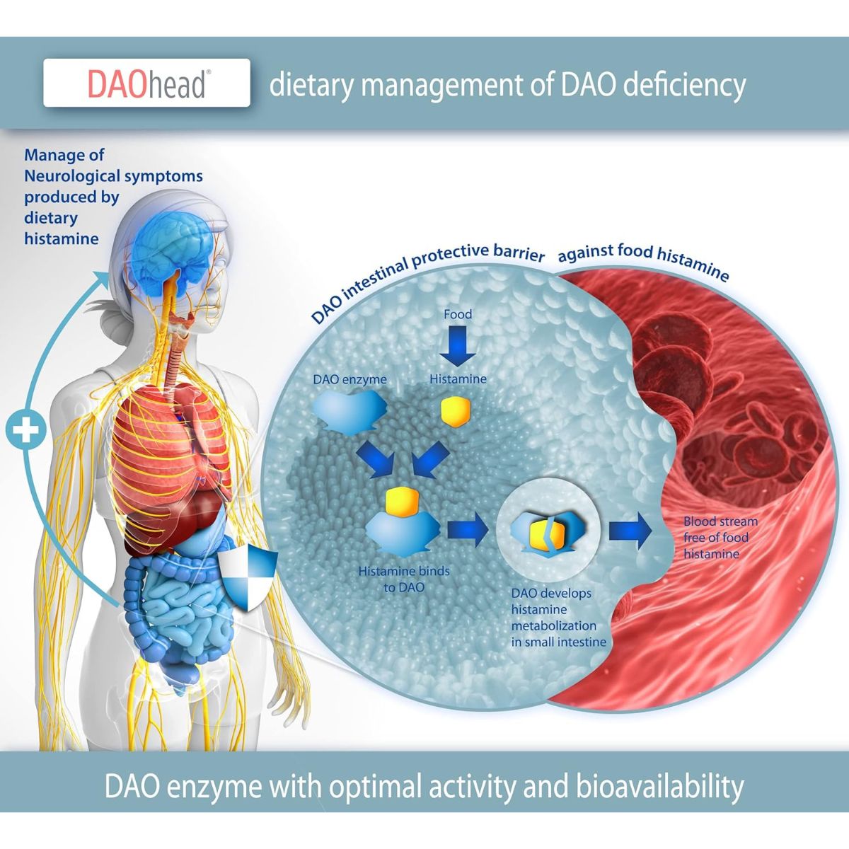 - Il contient du DAO d'origine porcine de haute pureté et biodisponibilité.