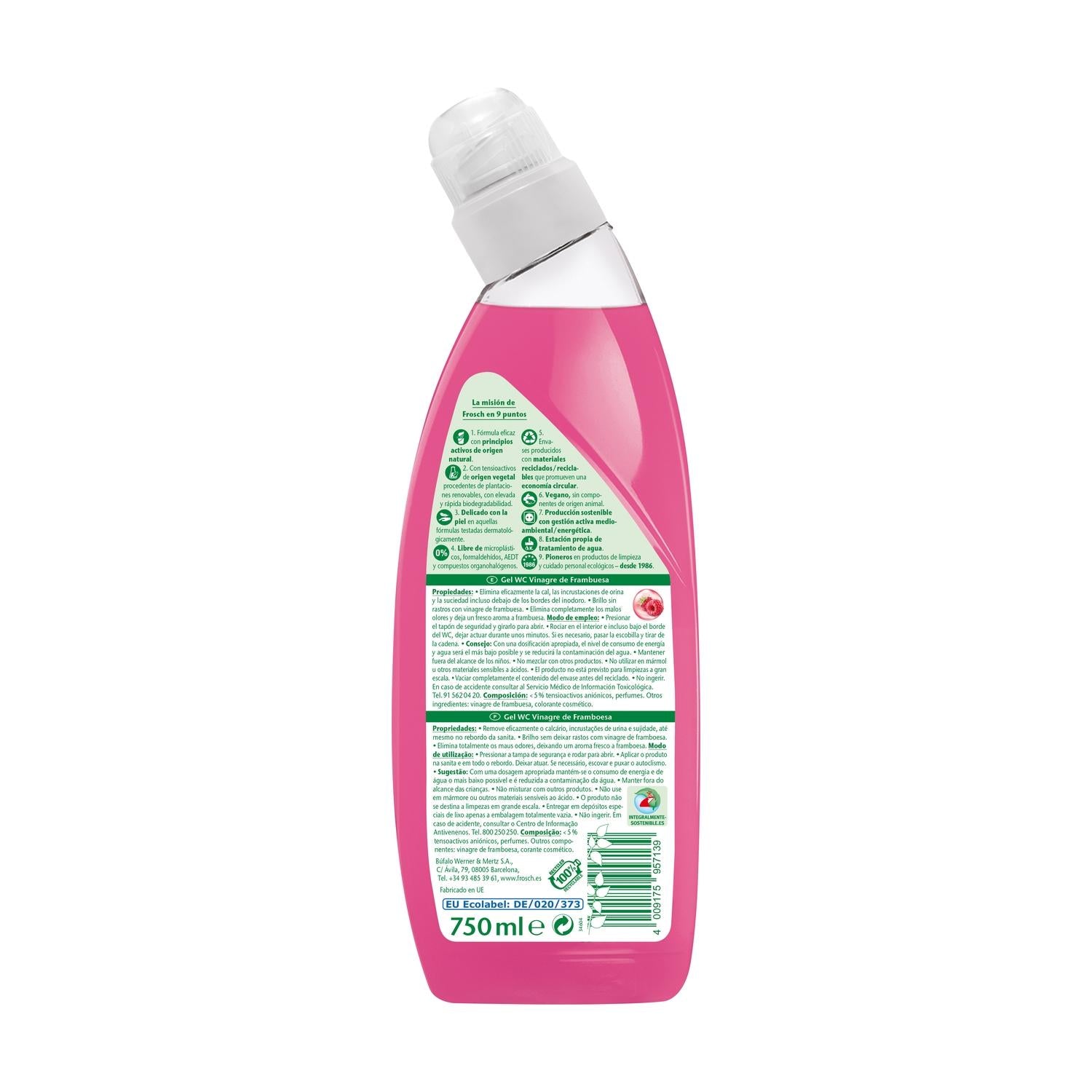 Le gel WC Frosch Eco au vinaigre de framboise est un nettoyant hygiénique et efficace, formulé à base d'extraits naturels de vinaigre de framboise. Il élimine le calcaire, les résidus et les incrustations, même sous le rebord, laissant les toilettes propres, sans odeur et agréablement parfumées à la framboise. Certifié par l'Écolabel européen.