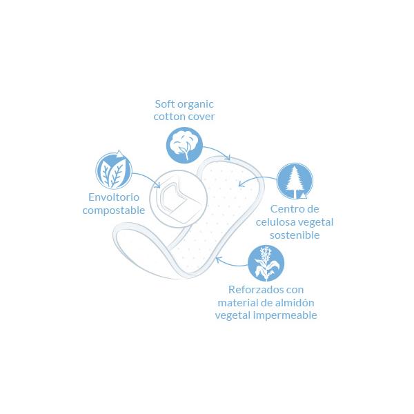 Ingrédients : Coton biologique certifié, pâte de cellulose biologique certifiée, amidon de maïs sans OGM, adhésif sans danger pour la santé