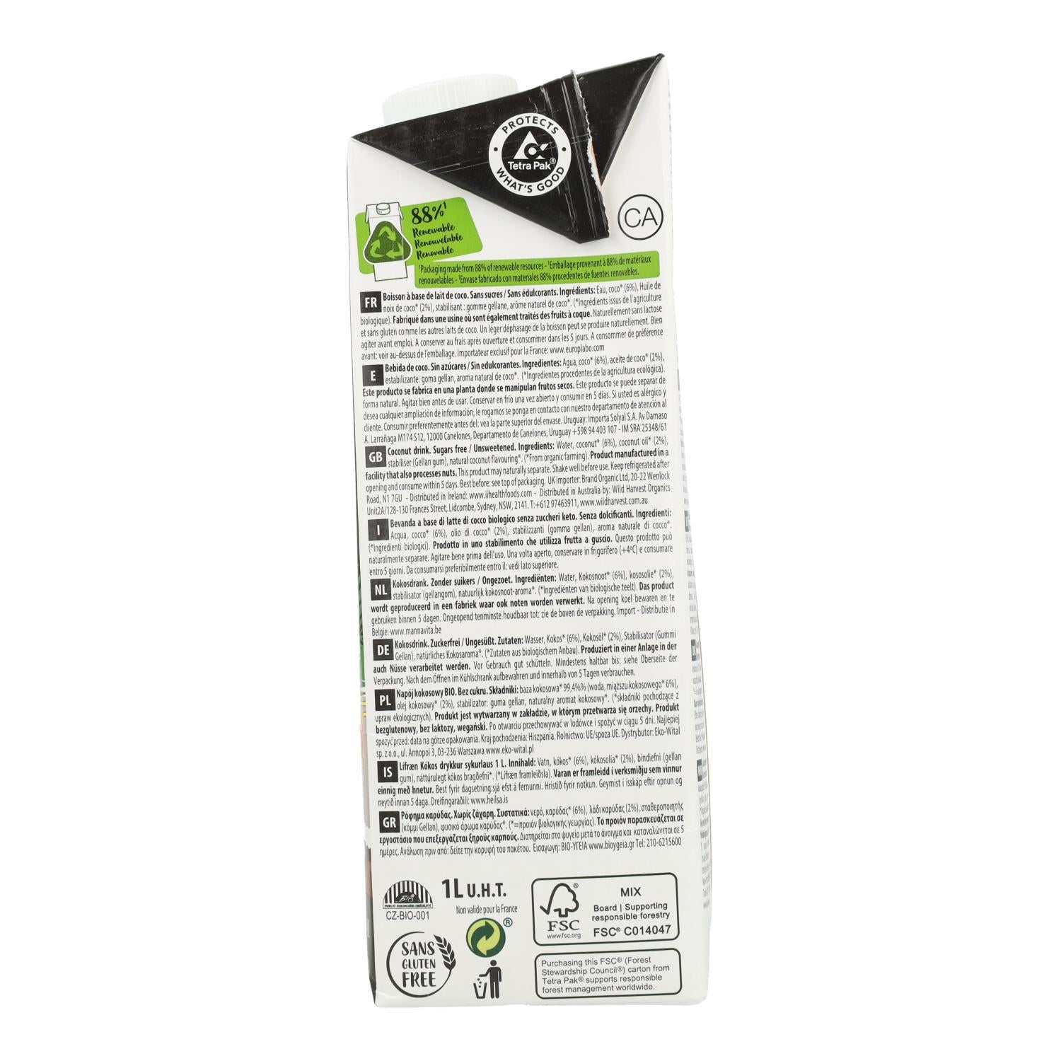Ingrédients : Eau, noix de coco* (6 %), huile de noix de coco* (2 %), stabilisant : gomme gellane, arôme naturel de noix de coco*. Ce produit est fabriqué dans un atelier qui transforme également des fruits à coque. *Ingrédients issus de l'agriculture biologique.