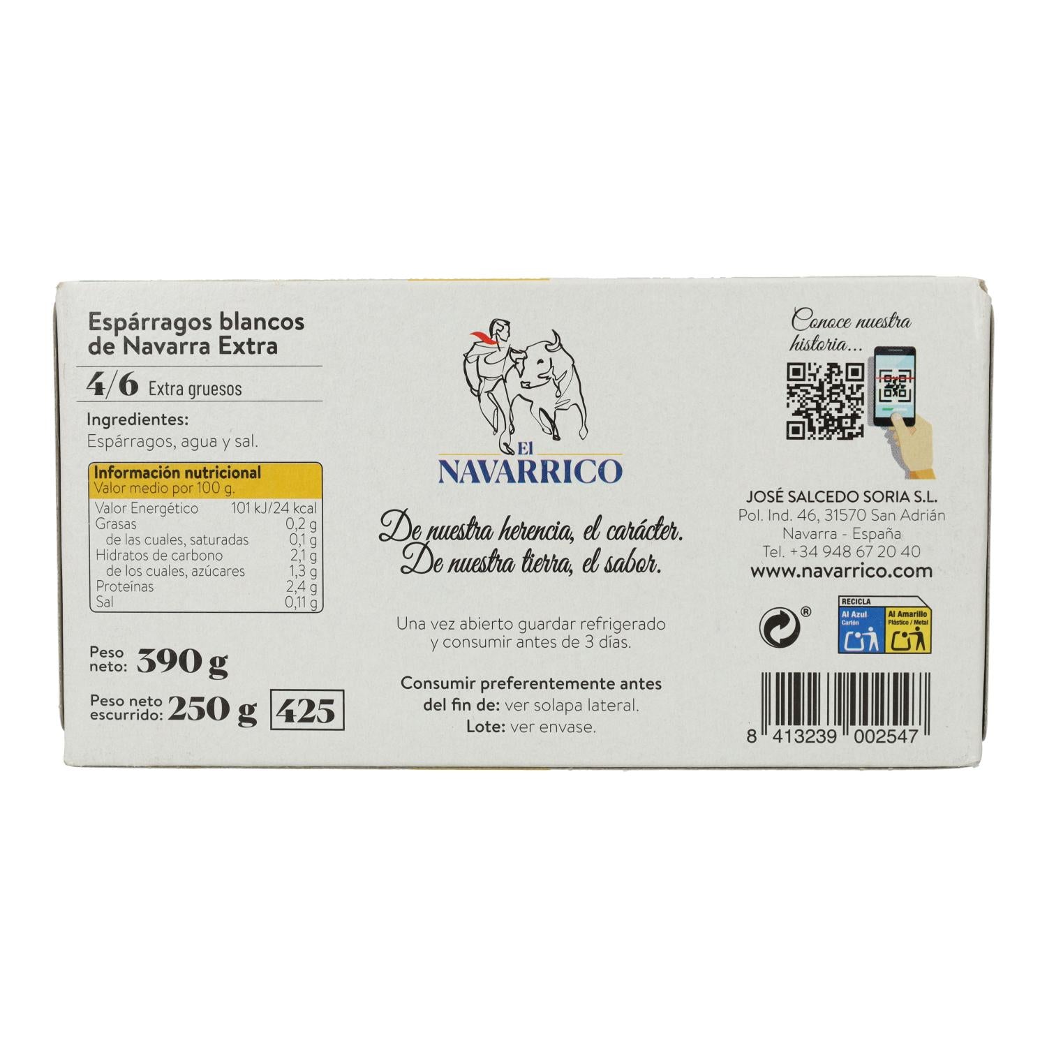 L' asperge blanche de Navarre Extra DO d'El Navarrico bénéficie de l'indication géographique protégée « Asperge de Navarre ».
